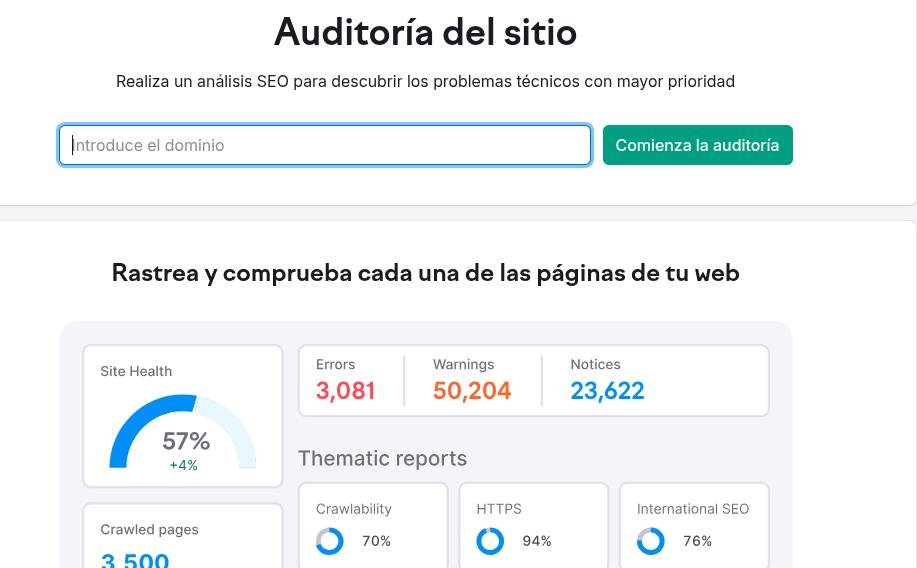 Para comenzar, accede a la herramienta Site Audit desde el panel lateral izquierdo de SEMrush. Aunque con limitaciones, podrás configurar un análisis básico de tu dominio seleccionando las opciones esenciales. La versión gratuita te permite escanear hasta 100 páginas, suficientes para sitios pequeños o para analizar las secciones más importantes de tu web.