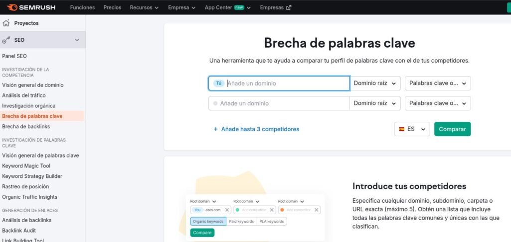 Para acceder a esta herramienta en la versión gratuita de SEMrush, dirígete al menú lateral y busca la sección «Análisis de competencia». Una vez allí, selecciona «Brecha de palabras clave». La interfaz te permitirá introducir hasta 5 dominios para comparar, aunque recuerda que con la cuenta gratuita tendrás acceso limitado a los resultados.