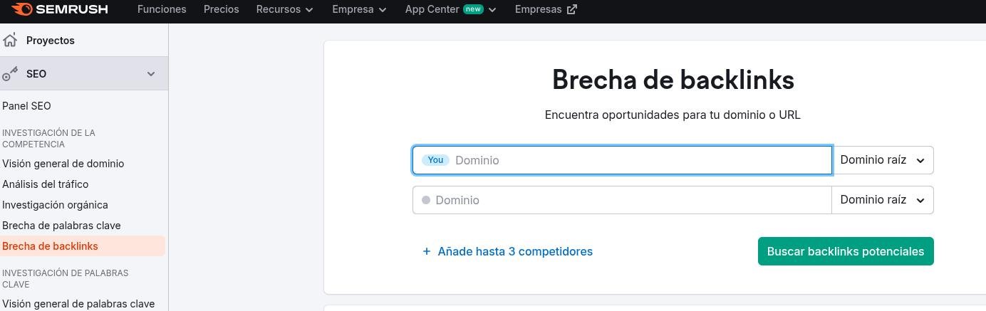 Para acceder a esta función dentro de las limitaciones gratuitas, dirígete al menú lateral de SEMrush y busca la sección «Análisis de Backlinks». Una vez allí, selecciona la opción «Backlink Gap». La versión gratuita te permite comparar tu dominio con hasta cuatro competidores, lo que resulta suficiente para obtener datos valiosos.